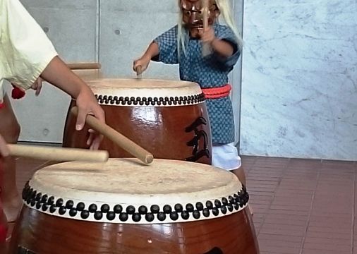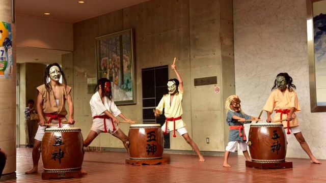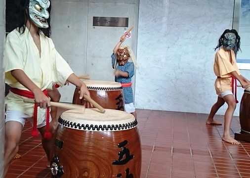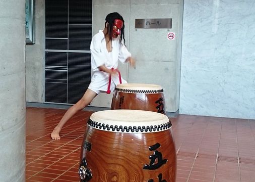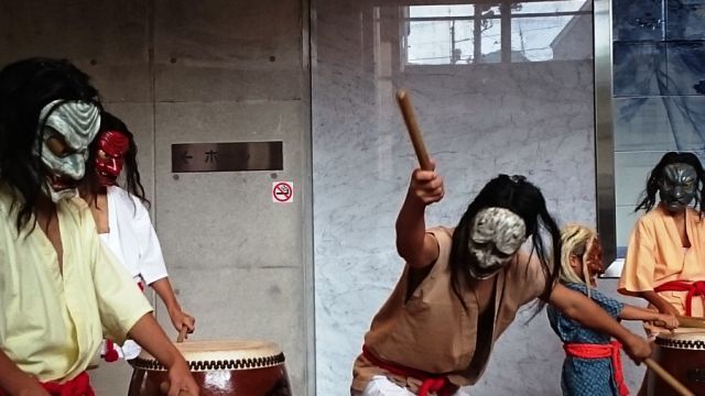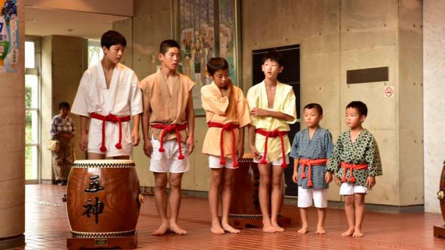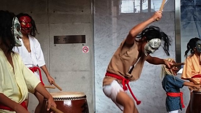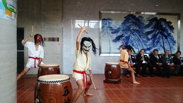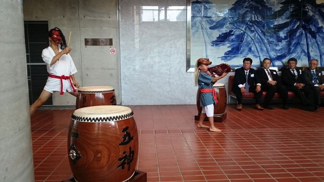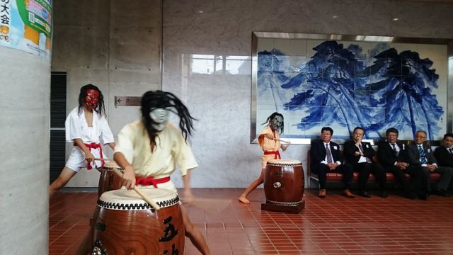 式典の前に、アトラクションとして「久万山五神太鼓」が披露されました。太鼓を演奏しているのは、幼稚園・小学1年生・中学生で、最年少の子は今日が初舞台だとのことです。それにしても、子供とは思えない力強い巧みなバチ捌きです。