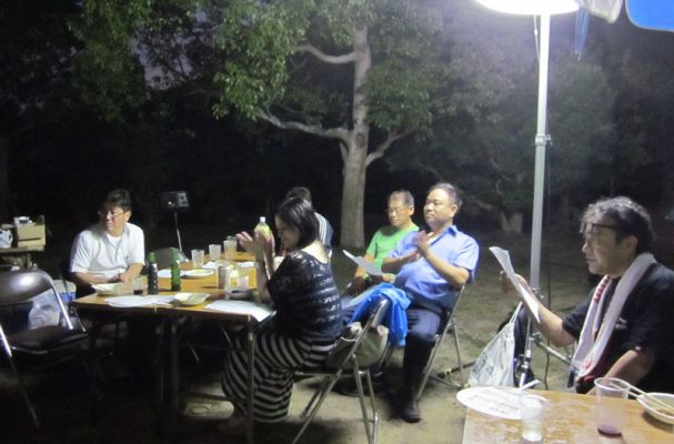 例会中、炭も熾り、網の上に肉を並べていよいよ焼けてきたという時!雨がパラパラし始めたかと思うと、急に土砂降りに!! 慌てて傘を差したりテントを広げたりと一騒動の後、雨は小降りになり、再び落ち着きを取り戻しました。一人一皿ずつ入れたタレは、雨で薄まってしまいました。尾道みなとLC女性会員さんの「あまだれ~」の一言に、みな苦笑。